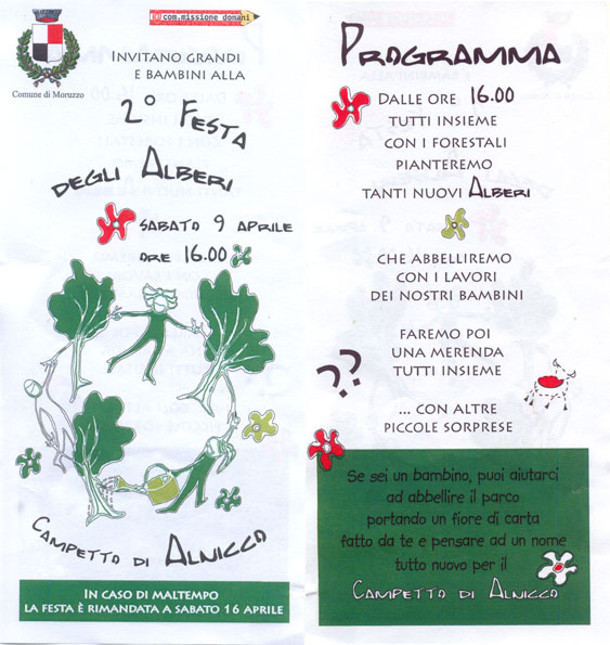 2a Festa degli AlberiAutore: Comune di Moruzzo - Comm.ne Domani Organizzato dal Comune di Moruzzo - Commissione domani Sabato 9 aprile al campetto di Alnicco - La Comm.ne domani del Comune di Moruzzo organizza una festa per piccoli e grandi. Alle ore 16 tutti insieme con i forestali pianteremo tanti nuovi alberi che abbelliremo con i lavori dei nostri bambini. Faremo oi una merenda tutti insieme... con tante altre piccole sorprese. Se sei un bambino puoi aiutarci ad abbellire il parco, portando un fiore di carta fatto da te e pensare ad un nome tutto nuovo per il campetto di Alnicco.