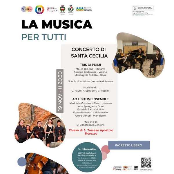 Concerto di Santa CeciliaAutore: Comune di Moruzzo Il Centro Culturale "Amici della Musica" vi invita sabato 19 novembre alle ore 20:30 presso la Chiesa di San Tomaso Apostolo di Moruzzo per il tradizionale Concerto di Santa Cecilia. Programma: TRIS DI PRIMI