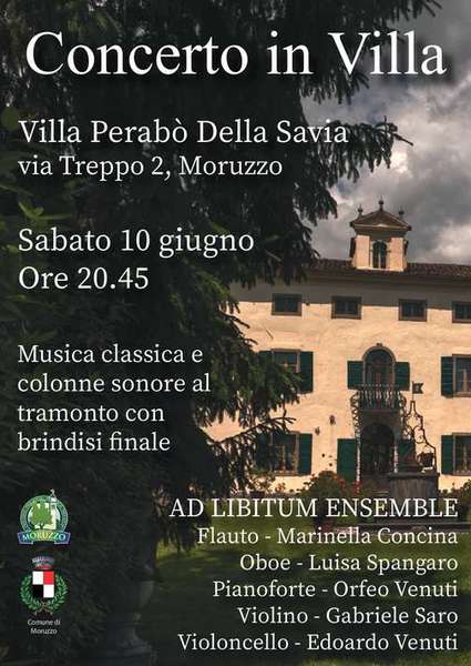 Concerto in VillaAutore: Pro Loco di Moruzzo Vi invitiamo sabato 10 giugno alle ore 20:45 presso Villa Perabò della Savia a Moruzzo per il concerto di musica classica e colonne sonore degli AD LIBITUM ENSEMBLE Flauto - Marinella Concina A seguire un brindisi con la Pro Loco Ingresso gratuito