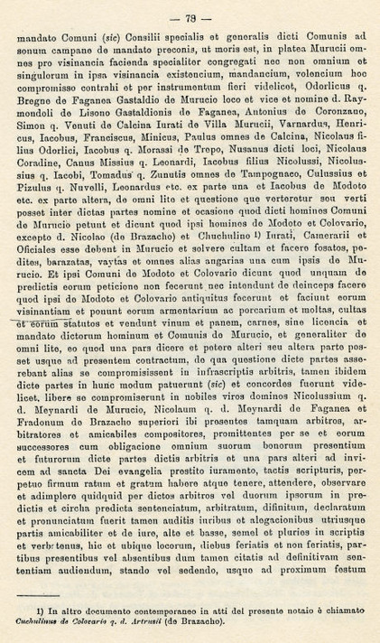 1301 - 6 giugno - Actum in cortina Murucii post quvam (?) Sancti Tomae. Notario pre' Giacomo di Santa Margherita. 1301 - 9 luglio - Actum in castro Morucii iuxta domum. Notaio pre' Giacomo di Moruzzo. 1321 - 17 agosto - In castro Morucii. 1321 - 27 agosto - in turri castri Morucii (probabilmente la torre ora demolita citata in precedenza che sovrintendeva il primo recinto del castello) Notario Pantaleone di Moruzzo. 1326 - 26 dicembre - In cortina Morucii, in ortum Johannis Paserat, notaio Pantaleone in Moruzzo. 1329 - 3 luglio - Actum in castro Morucii ante portam pontis. Notaio pre' Giacomo di Santa Margherita. 1334 - 8 marzo - In platea cortinae Morutii. Pantaleone notaio. 1336 - 22 marzo - Actum in cortina Morucii in platea. Notaio pre' Giacomo di Santa Margherita. 1337 - 14 luglio - In Morucio sub domo comunis. Notaio Pantaleone. 1346 - 7 marzo - Divisione del borgo del castello di Moruzzo fra i tre figli del fu quondam Mainardo da Moruzzo. In burgo castri Morucii. 1348 - 10 ottobre - In burgo castri de Morucii - notaio Pantaleone di Moruzzo 1352 - 27 novembre - In domo comunis Morucii - Giovanni di Moruzzo - notaio. 1353 - In platea sancti Tomae de Morucio propetileum 1332 - In burgo de Morucio propae canipam olim presbiteri Jacobi. Notaio Giovanni di Moruzzo. 1366 - 15 febbraio - In cortina sancti Tomae de Morucio. Giovanni da Moruzzo Notaio. 1368 - 18 agosto - In platea de Morucio propae tileos. Giovanni da Moruzzo notaio. 1378 - 1 giugno - In cortina Sancti Tomae de Morucio. " 1379 - 4 febbraio - In cortina Sancti Tomae de Morucio in canipam eredum quondam Nicolai Minisuti de Modoto. " 1353 - 7 aprile - In platea Sancti Tomae de Morucio proprae tileos. " 1353 - 8 settembre - In platea Moruci proprae tileum. " 1355 - 6 maggio - In cortina Sancti Tomae de Morucio. "