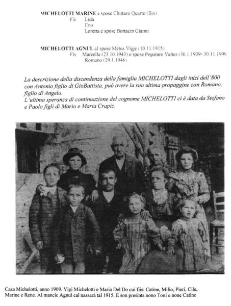 Pieri Michelotti al spose Catine Masetti 29 5 1909 + 26 3 1989 Fiis: Ermanno 21 2 1933 al spose Luciana Bovolon Marine Michelotti e spose Quarto Chittaro (Bis) Fiis: Lida Eno Loretta e spose Gianni Bottaccin Agnul Michelotti al spose Vigjie Metus 10 11 1915 GFiis: Marcella 23 10 1943 e spose Valter Pegoraro 30 1 1939 + 30 11 1999 Romano 29 1 1 946 (La descrizione della discendenza della famiglia Michelotti dagli inizi del 1800 con Antonio figlio di Giovanni Battista può avere la sua ultima propaggine con don Romano Michelotti, figlio di Angelo. L'ultima speranza di ontinuazione del cognome Michelotti ci è data da Stefano e Paolo, figli di Mario e Maria Crapiz.) |