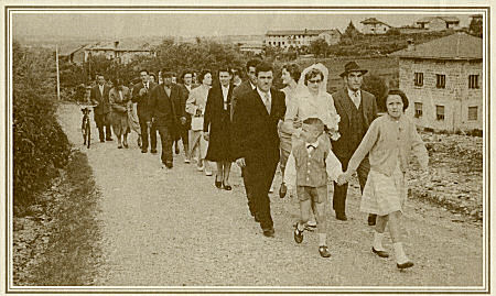 - Corteo nuziale dalla chiesa verso il municipio. Sullo sfondo si può vedere com'era la campagna di Moruzzo.